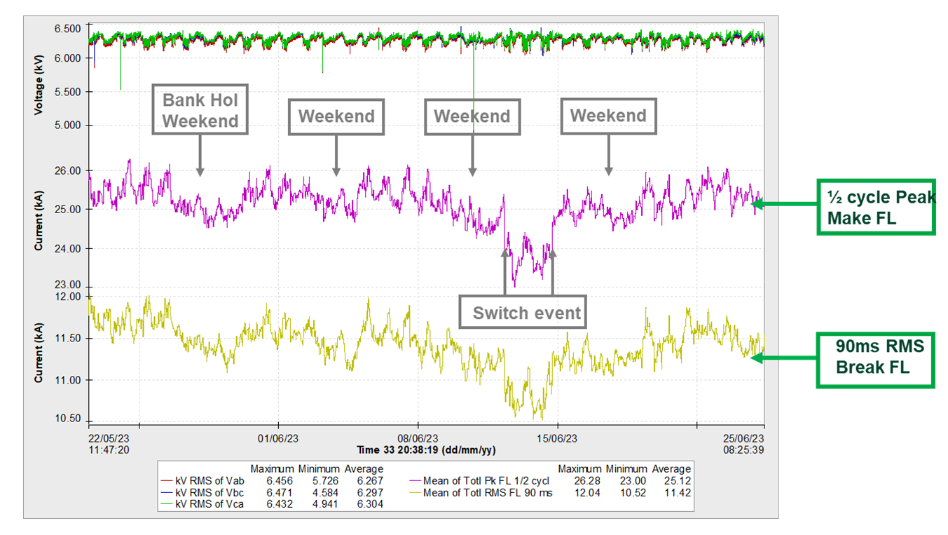 Waveforms taken from RTFLM installation in Liverpool, UK, over a five-week period. The top waveforms are the voltage measurements taken from the VT. The middle waveform is peak ½ cycle FL, and the bottom waveform is Root Mean Squared (RMS) break FL.